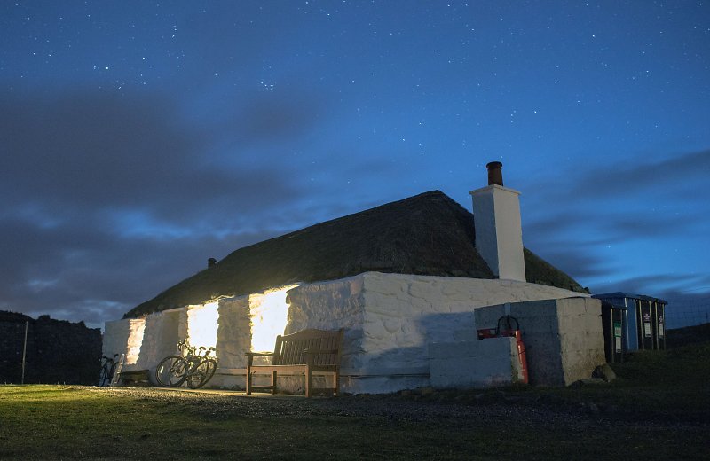 The Gatliff Trust hostel at Baile on Berneray is situated immediately adjacent to the sea and looks as welcoming by night as by day.